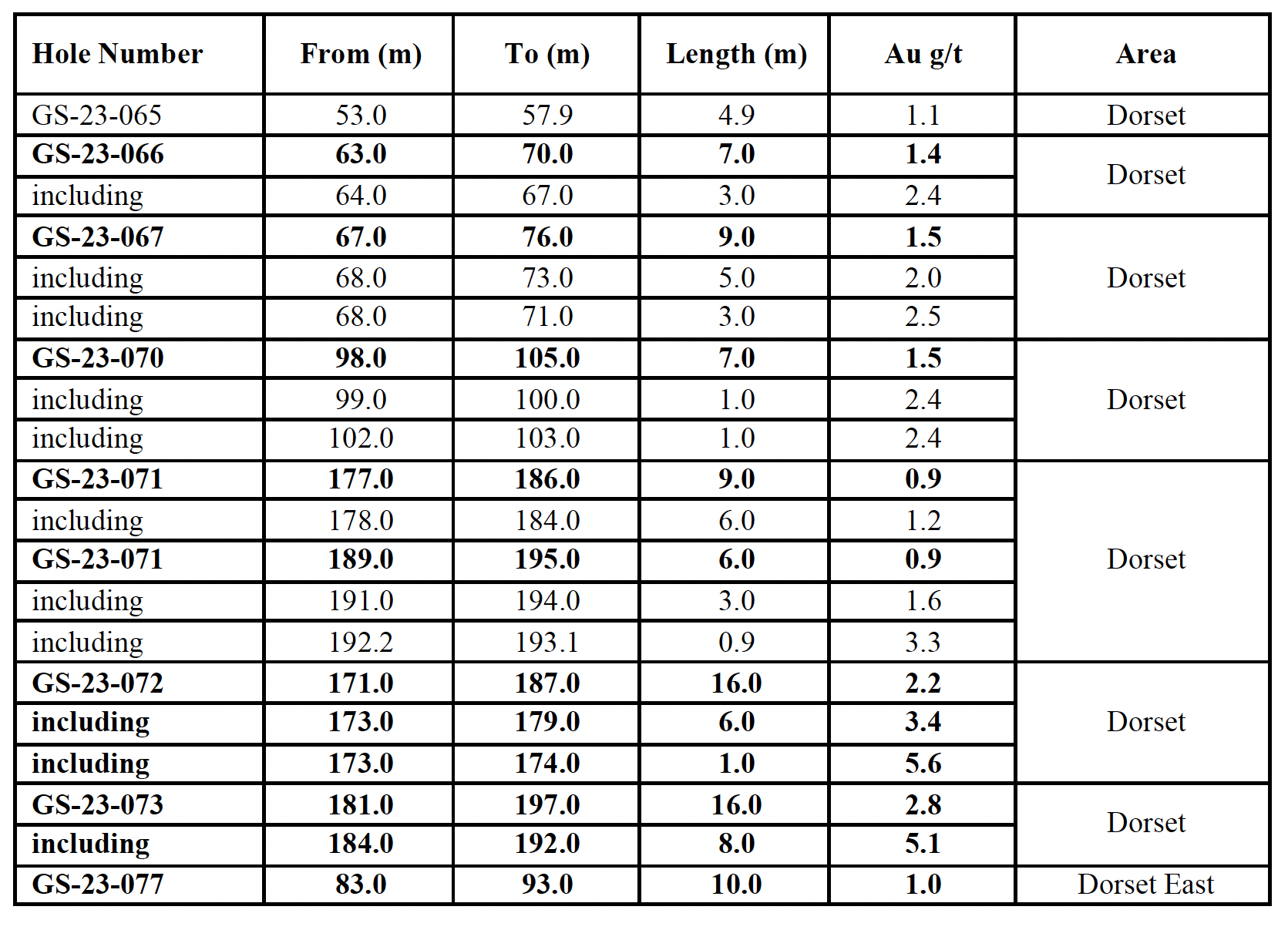 Winter 2023 infill drilling program at the Dorset Zone intersected significant gold mineralization including 5.1 g/t Au over 8.0 metres within a broader zone of 2.8 g/t Au over 16.0 metres and 3.4 g/t Au over 6.0 metres within a wider interval of 2.2 g/t Au over 6.0 metres