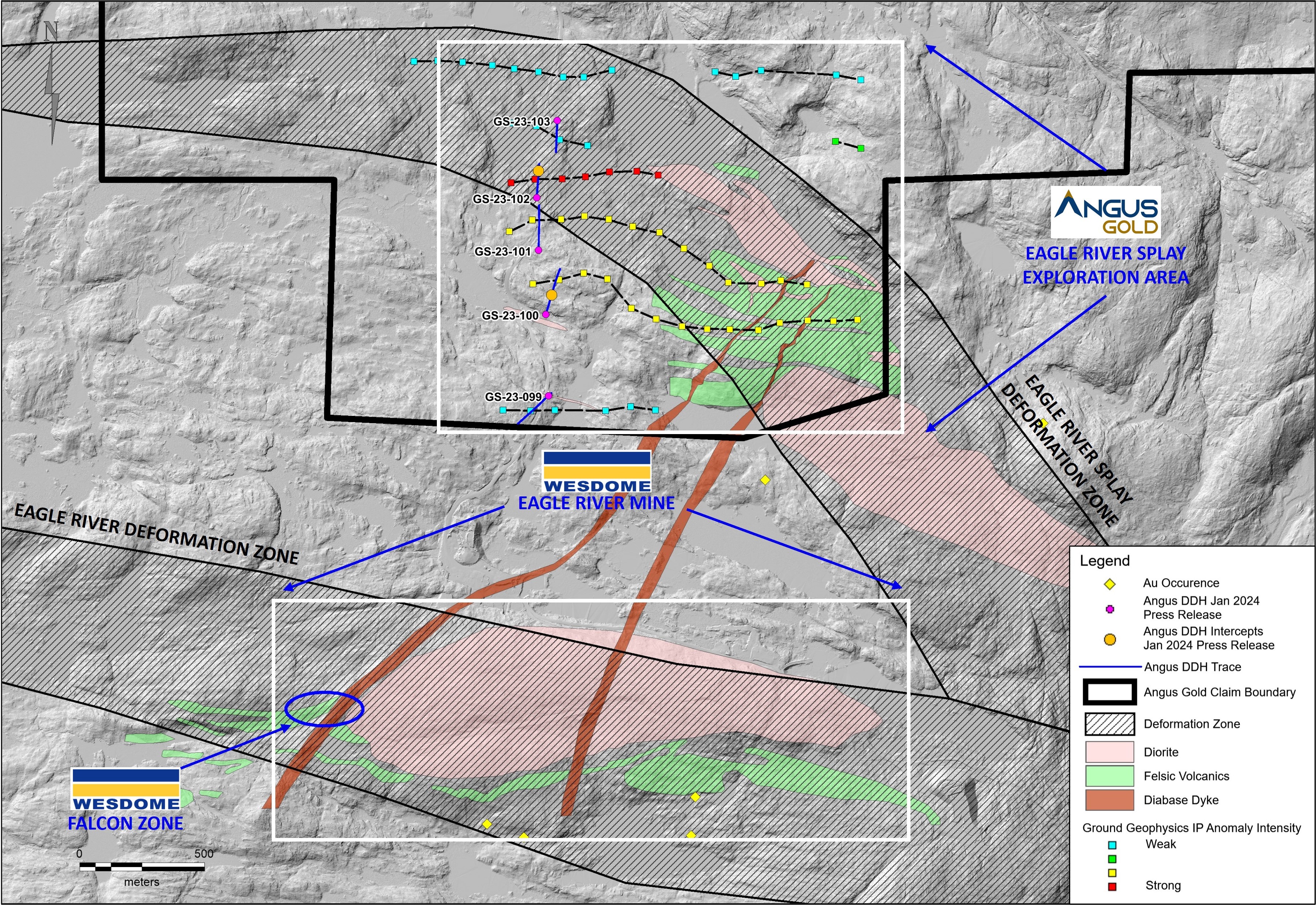 TORONTO, January 9, 2024 – AGI. (TSX-V: GUS | OTC: ANGVF ) (“ Angus ” or the “ Company ”) is pleased to announce assay results from five (5) drill holes, totaling 1,272 metres, completed during the fall 2023 drilling program on the Eagle River Splay Area on its 100%-owned Golden Sky Project in Wawa, Ontario. The Eagle River Splay Area is located between Angus’ newly discovered Banded Iron Formation (“BIF”) Gold Zone and the high-grade Eagle River gold mine of Wesdome Gold Mines Ltd. (“ Wesdome ”) to the south. This new exploration area covers an offshoot, or splay, of the Eagle River Deformation Zone which is host to Wesdome’s mine.