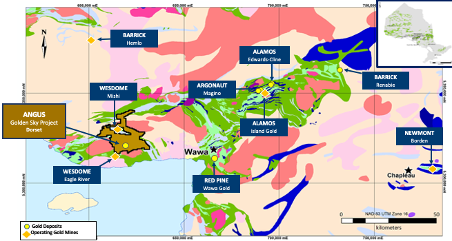 The 100%-owned Golden Sky Project is located within the Mishibishu Lake Greenstone Belt of Northern Ontario, which is host to the high-grade Eagle River and the Mishi open-pit gold mines of Wesdome Gold Mines Ltd. (“Wesdome”). The Company’s 261-square-kilometres land package is located approximately 50 kilometres west of the town of Wawa and is situated immediately between the two Wesdome mines. The project is host to the near-surface Dorset Gold Zone, which contains a historic estimated resource (using a 0.50 g/t Au cut-off) consisting of an indicated resource of 40,000 ounces of gold (780,000 tonnes grading 1.4 g/t Au), and an inferred resource of 180,000 ounces of gold (4,760,000 tonnes grading 1.2 g/t Au).